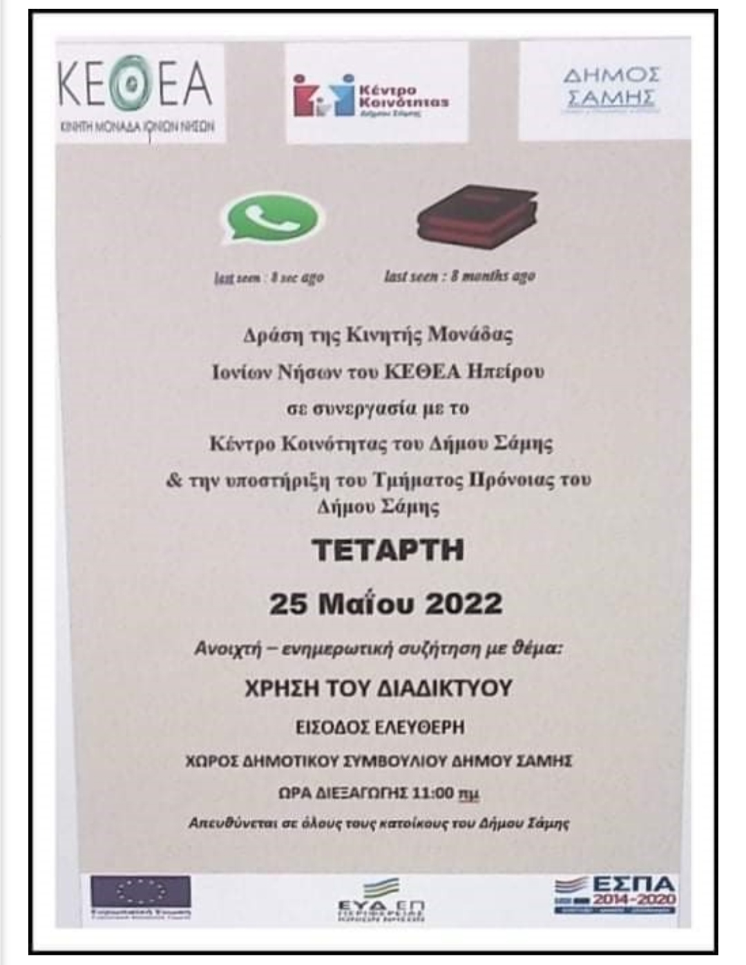 Την Τετάρτη 25 Μαΐου 2022 & ώρα 11:00 το Κέντρο Κοινότητας του Δήμου Σάμης, σε συνεργασία με την Κινητή Μονάδα του ΚΕΘΕΑ Ιονίων Νήσων και την υποστήριξη του Τμήματος Πρόνοιας του Δήμου, θα πραγματοποιήσει δράση ανοιχτής ενημερωτικής συζήτησης με θέμα «Χρήση του Διαδικτύου».