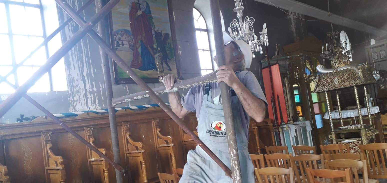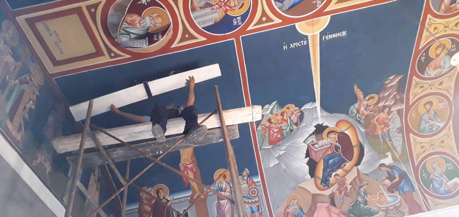 Προκειμένου να αποφευχθεί μεγαλύτερη ζημία στην οροφή και στην αγιογράφηση, αλλά και να αποτραπεί ο κίνδυνος ατυχήματος, οι συγχωριανοί μας Βασίλης Τουλάτος του Γρηγορίου και Παντελής Τουλάτος του Νικολάου τοποθέτησαν εχθές το απόγευμα σκαλωσιές και τάβλες στο επίμαχο σημείο. Μάλιστα ο Πατέρας Σπυρίδωνας ευχαριστεί δημόσια τους δύο συγχωριανούς μας για την άμεση και κυρίως εθελοντική ανταπόκρισή τους.