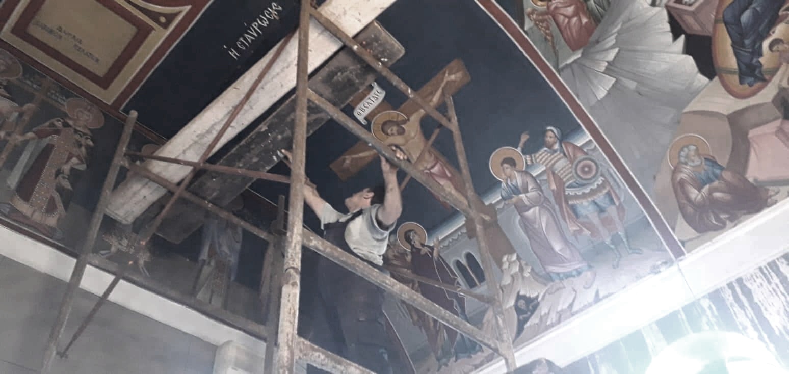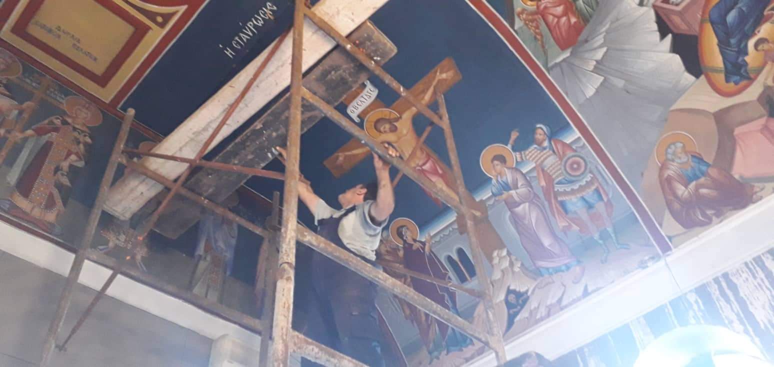 Προκειμένου να αποφευχθεί μεγαλύτερη ζημία στην οροφή και στην αγιογράφηση, αλλά και να αποτραπεί ο κίνδυνος ατυχήματος, οι συγχωριανοί μας Βασίλης Τουλάτος του Γρηγορίου και Παντελής Τουλάτος του Νικολάου τοποθέτησαν εχθές το απόγευμα σκαλωσιές και τάβλες στο επίμαχο σημείο. Μάλιστα ο Πατέρας Σπυρίδωνας ευχαριστεί δημόσια τους δύο συγχωριανούς μας για την άμεση και κυρίως εθελοντική ανταπόκρισή τους.