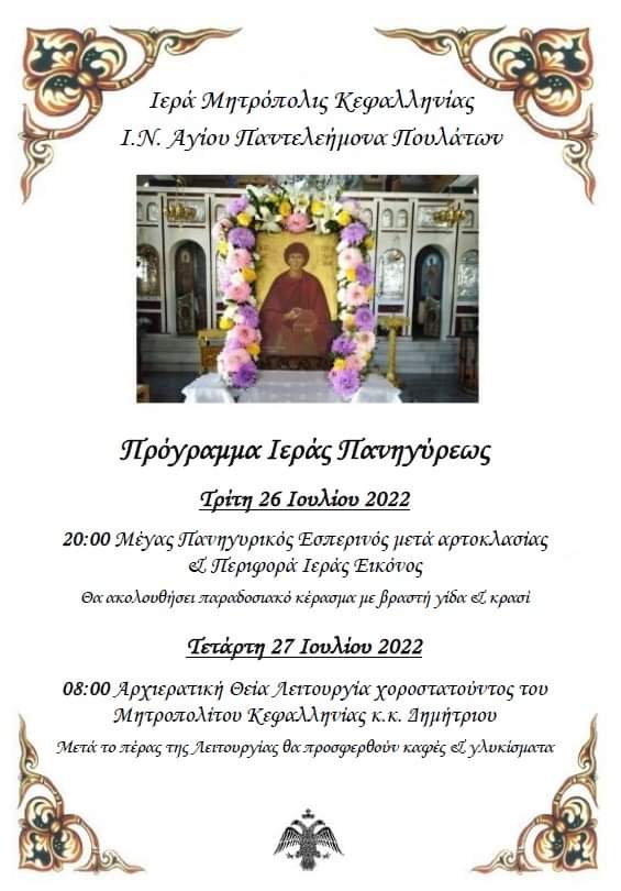 Οι κάτοικοι, το εκκλησιαστικό συμβούλιο και ο εφημέριος των Πουλάτων, σας προσκαλούμε στις εκκλησιαστικές εκδηλώσεις για την εορτή του πολιούχου του χωριού μας Αγίου Παντελεήμονα, την Τρίτη 26 και την Τετάρτη 27 Ιουλίου.