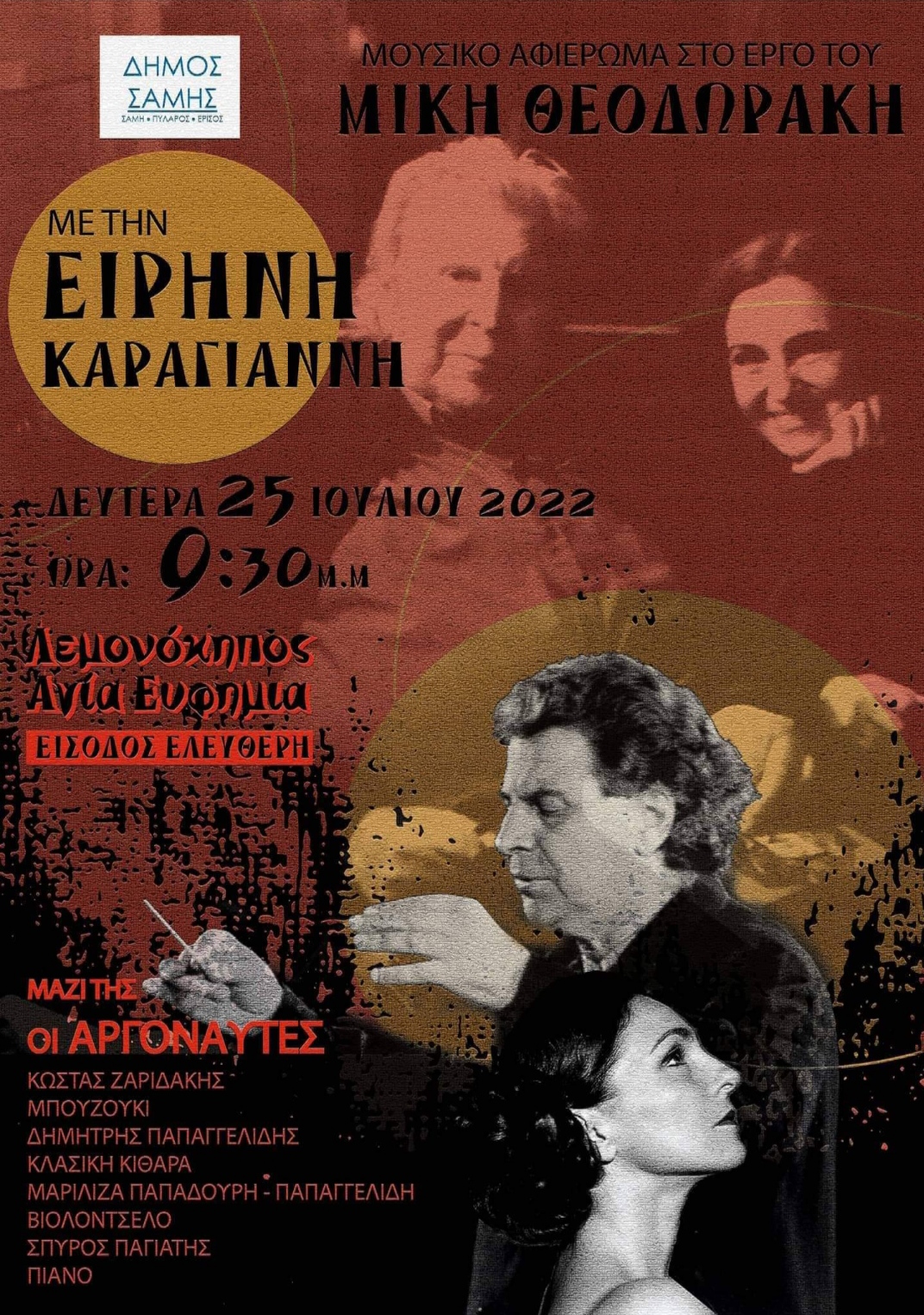 Ο Δήμος Σάμης σας ενημερώνει ότι σήμερα Δευτέρα 25 Ιουλίου θα πραγματοποιηθεί στην Αγία Ευφημία (Λεμονόκηπος) στις 21:30, συναυλία με την Ειρήνη Καράγιαννη αφιερωμένη στον μεγάλο δημιουργό Μίκη Θεοδωράκη.