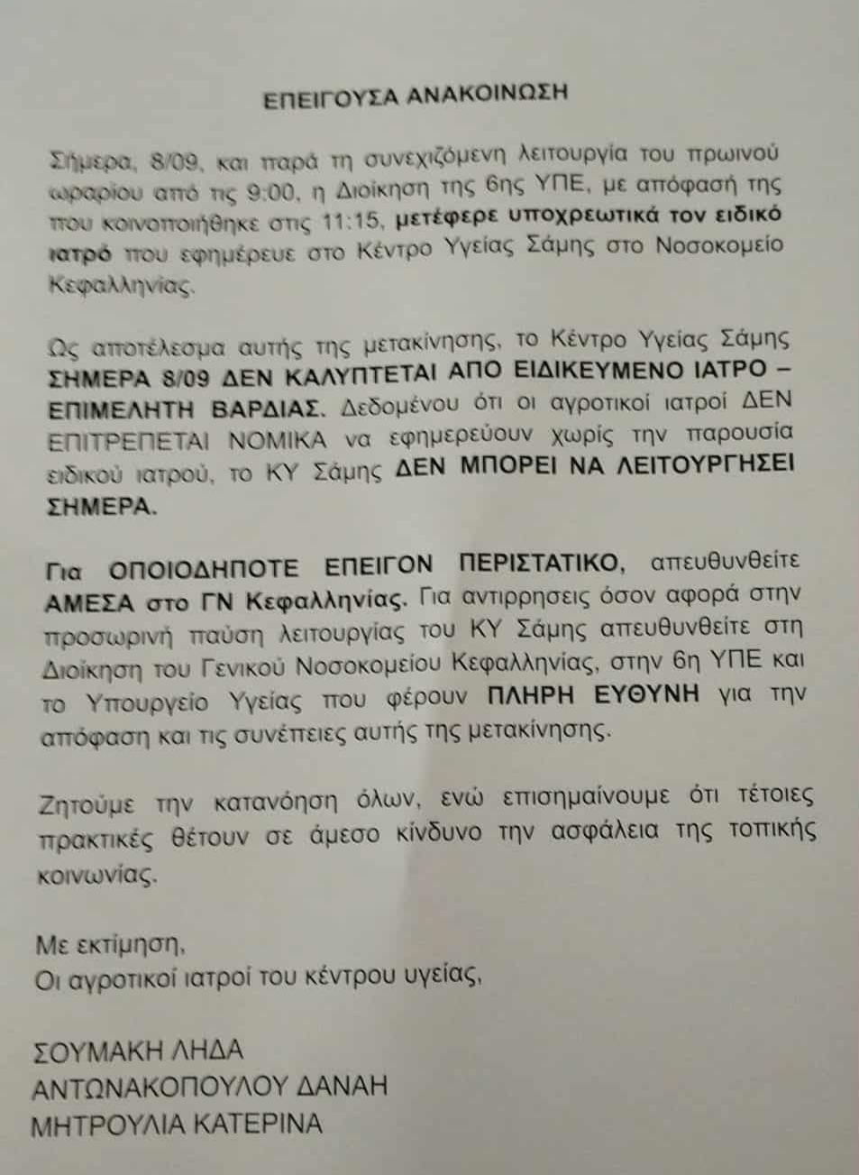 Αν δεν διαβάζαμε με τα μάτια μας την ανακοίνωση που εξέδωσαν οι αγροτικοί ιατροί του Κέντρου Υγείας Σάμης, θα θεωρούσαμε ότι πρόκειται για ένα κακόγουστο αστείο.