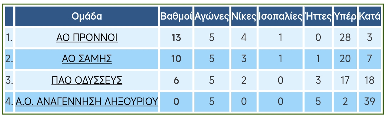 Στο έτερο παιχνίδι του ομίλου ο Οδυσσέας Ιθάκης επικράτησε στο Σταυρό της Αναγέννησης Ληξουρίου με το ευρύ 7-0 και κατέκτησε και μαθηματικά την τρίτη θέση του ομίλου, που ωστόσο τον αφήνει εκτός οκτάδας.