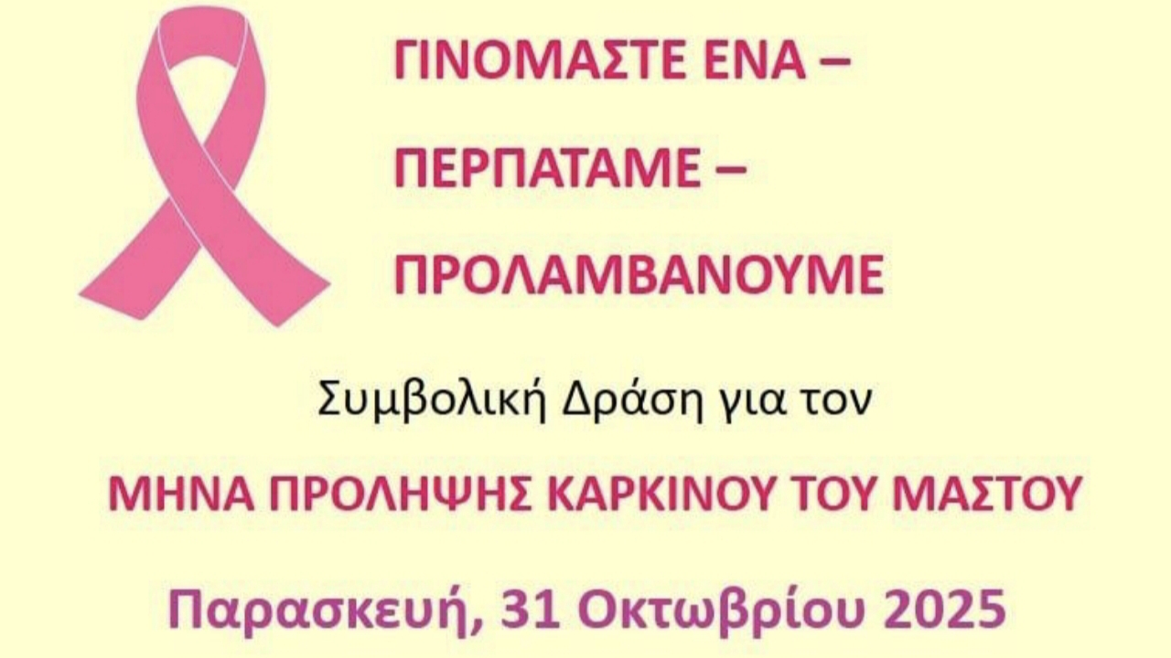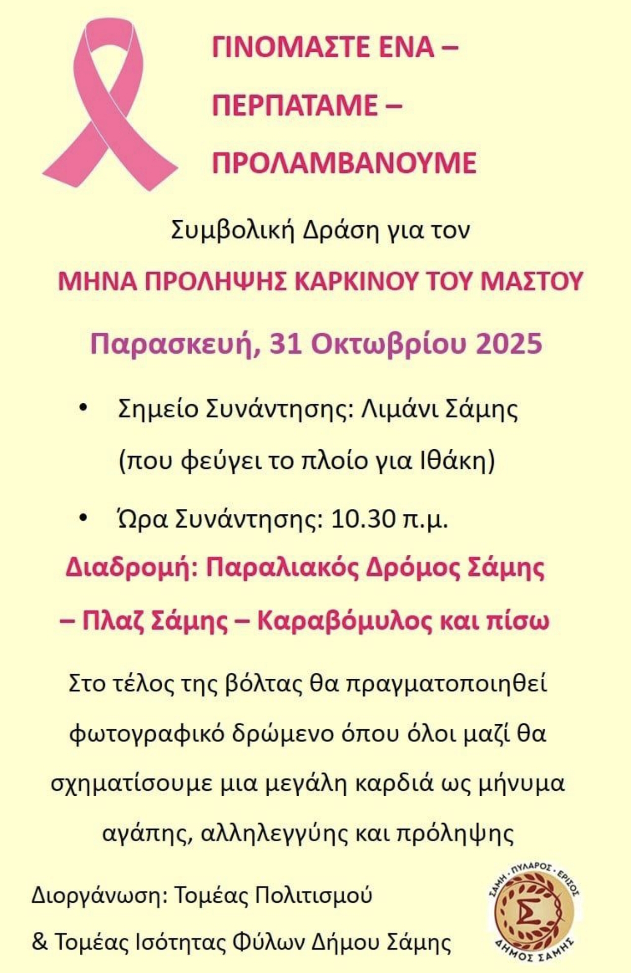 Ειδικότερα, με αφορμή τον μήνα πρόληψης του καρκίνου του μαστού, την Παρασκευή στις 10:30 θα πραγματοποιηθεί περίπατος από την παραλία της Σάμης μέχρι τον Καραβόμυλο με επιστροφή και ακολούθως φωτογραφικό δρώμενο με όλους τους συμμετέχοντες να σχηματίζουν μία μεγάλη καρδιά και να μεταφέρουν το μήνυμα της αγάπης, της αλληλεγγύης και της πρόληψης.