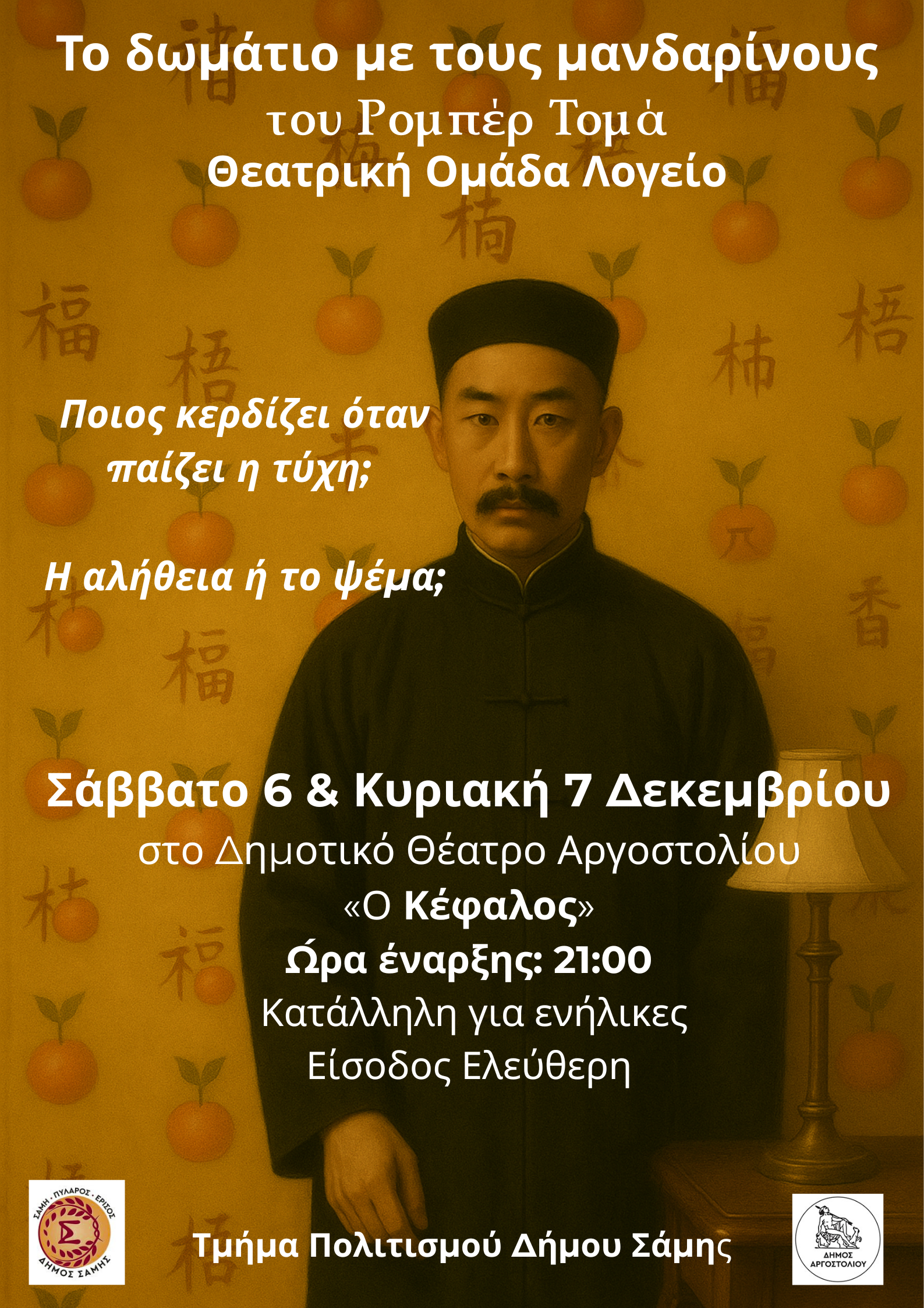 Το Θεατρικό Εργαστήρι του Δήμου Σάμης, με τη θεατρική ομάδα «Λογείο» επανέρχεται με την παράσταση «Το δωμάτιο με τους Μανδαρίνους» του Ρομπέρ Τομά. Ένα έργο όπου τίποτα δεν είναι όπως φαίνεται, και όπου όσα δεν λέγονται είναι πιο ηχηρά από όσα ομολογούνται.