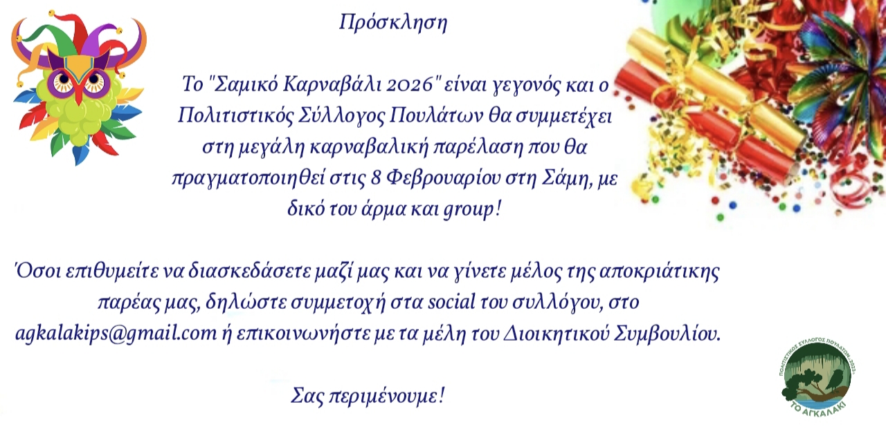 Το “Σαμικό Καρναβάλι 2026” είναι γεγονός και ο Πολιτιστικός Σύλλογος Πουλάτων “Το Αγκαλάκι” ως εκ των συνδιοργανωτών συλλόγων, θα συμμετέχει στη μεγάλη καρναβαλική παρέλαση που θα πραγματοποιηθεί στις 8 Φεβρουαρίου στη Σάμη, με δικό του άρμα και group!
