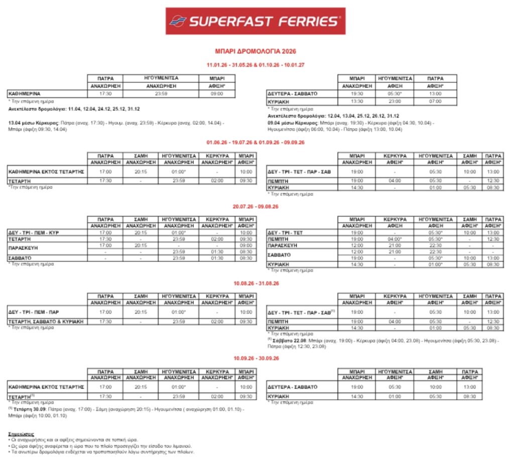 Μία σημαντική είδηση αλιεύσαμε στο διαδίκτυο, καθώς, όπως αναφέρει ο έγκυρος ιστότοπος ellinikiaktoploia.net από 01/06/2026 έως 30/09/2026 τα πλοία της Superfast Ferries που εκτελούν το δρομολόγιο Πάτρα – Ηγουμενίτσα – Μπάρι, θα  προσεγγίζουν το λιμάνι της Σάμης, τις ημέρες που δεν θα υπάρχει προσέγγιση στην Κέρκυρα.