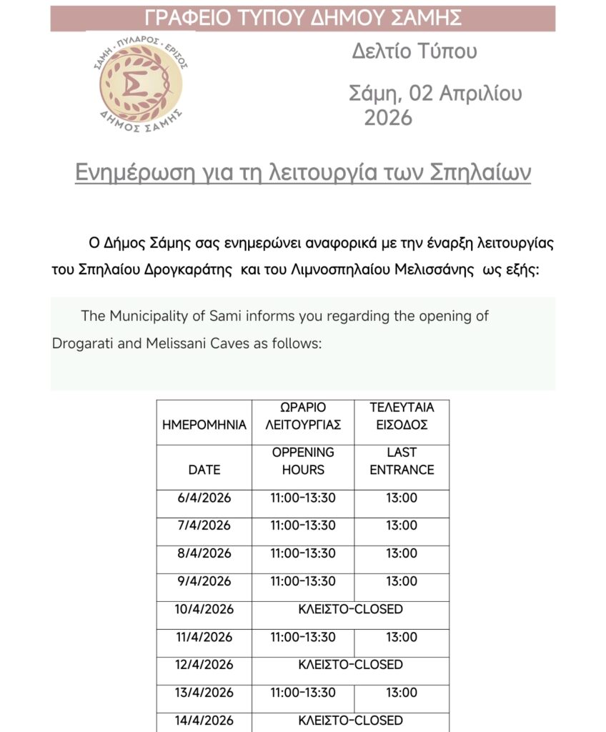 ΑρχικήΑνακοινώσειςΤο ωράριο λειτουργίας των σπηλαίων Μελισσάνης και Δρογγαράτης