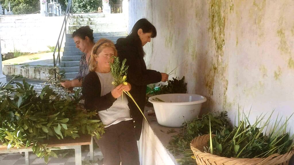 Τηρώντας το έθιμο της ημέρας, γυναίκες των Πουλάτων ετοίμασαν το πρωί τα βάγια και στόλισαν την εκκλησία του Αγίου Παντελεήμονα, ενόψει της Θείας Λειτουργίας της Κυριακής των Βαΐων.