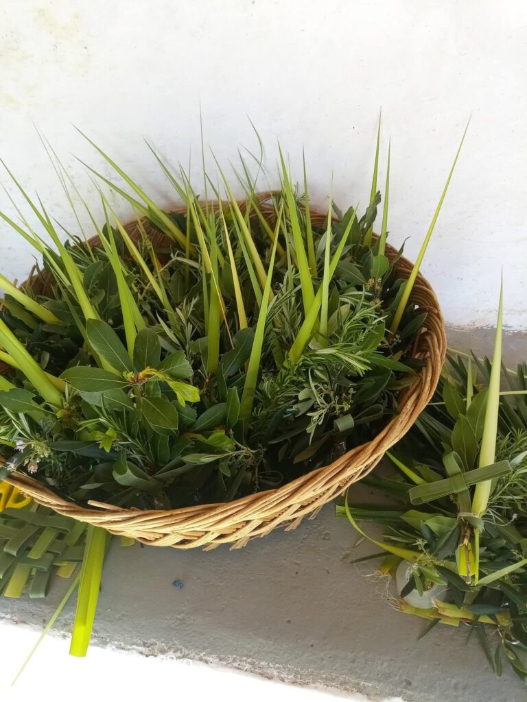 Τηρώντας το έθιμο της ημέρας, γυναίκες των Πουλάτων ετοίμασαν το πρωί τα βάγια και στόλισαν την εκκλησία του Αγίου Παντελεήμονα, ενόψει της Θείας Λειτουργίας της Κυριακής των Βαΐων.