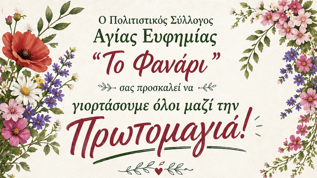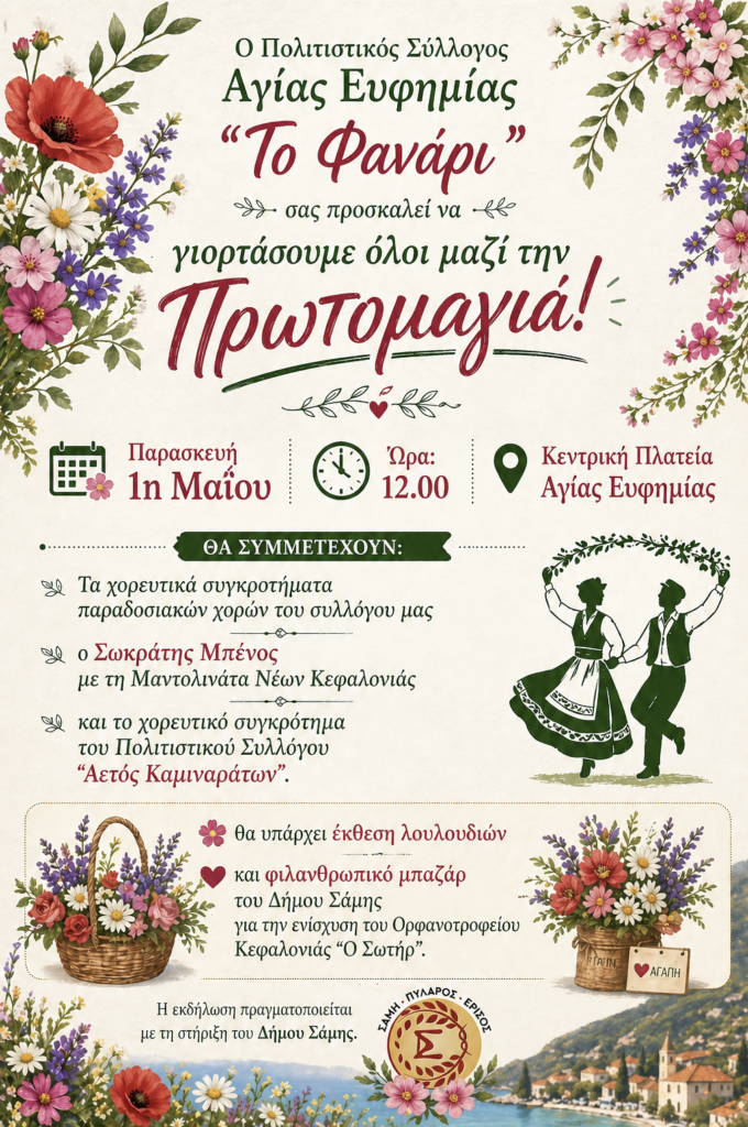 ΑρχικήΆλλες ειδήσειςΠρωτομαγιά στην Αγία Ευφημία 29 Απριλίου 2026 Updated: 29 Απριλίου 2026 Πρωτομαγιά στην Αγία Ευφημία By poulatakefalonias κοινοποίηση FacebookTwitterPinterestWhatsAppCopy URL Ο Πολιτιστικός Σύλλογος Αγίας Ευφημίας “Το Φανάρι” σας προσκαλεί να γιορτάσουμε όλοι μαζί την Πρωτομαγιά στην Κεντρική Πλατεία του χωριού. Πηγή: poulatakefalonias.gr κοινοποίηση FacebookTwitterPinterestWhatsAppCopy URL poulatakefalonias Μείνε συνδεδεμένος 1,093ΥποστηρικτέςΚάντε Like280ΑκόλουθοιΑκολουθήστε206ΑκόλουθοιΑκολουθήστε188ΣυνδρομητέςΓίνετε συνδρομητής ΕΠΙΛΟΓΕΣ Ανακοινώσεις Ξεκινά η αντιπυρική περίοδος. Τι πρέπει να προσέξουμε. Οδηγίες από την Πολιτική Προστασία του Δήμου Σάμης. 29 Απριλίου 2026 Τα νέα του χωριού μας Κλάδεμα ψηλών δέντρων στην πλατεία των Πουλάτων 28 Απριλίου 2026 Ανακοινώσεις Διακοπή υδροδότησης αύριο στον Καραβόμυλο 28 Απριλίου 2026 Άλλες ειδήσεις Αυτή την Πρωτομαγιά, όλοι οι δρόμοι οδηγούν στ’ Αγρίλια 25 Απριλίου 2026 ΔΙΑΒΑΣΤΕ ΑΚΟΜΑ Ανακοινώσεις Ξεκινά η αντιπυρική περίοδος. Τι πρέπει να προσέξουμε. Οδηγίες από την Πολιτική Προστασία του Δήμου Σάμης. 29 Απριλίου 2026 Τα νέα του χωριού μας Κλάδεμα ψηλών δέντρων στην πλατεία των Πουλάτων 28 Απριλίου 2026 Ανακοινώσεις Διακοπή υδροδότησης αύριο στον Καραβόμυλο 28 Απριλίου 2026 Άλλες ειδήσεις Αυτή την Πρωτομαγιά, όλοι οι δρόμοι οδηγούν στ’ Αγρίλια 25 Απριλίου 2026 Ανακοινώσεις Πρόγραμμα εορτασμού επανακομιδής Ιερών Λειψάνων Αγίων Φανέντων 24 Απριλίου 2026 ΑΦΗΣΤΕ ΜΙΑ ΑΠΑΝΤΗΣΗ Ακύρωση απάντησης Σχόλιο: εισάγετε το σχόλιό σας! Όνομα:* παρακαλώ εισάγετε το όνομά σας εδώ Email:* έχετε εισάγει εσφαλμένη διεύθυνση ηλεκτρονικού ταχυδρομείου! παρακαλώ εισάγετε εδώ την ηλεκτρονική σας διεύθυνση Ιστοσελίδα: αποθηκεύστε το όνομα, το ηλεκτρονικό ταχυδρομείο και τον ιστότοπό μου σε αυτό το πρόγραμμα περιήγησης για την επόμενη φορά που θα σχολιάσω. Δ This site uses Akismet to reduce spam. Learn how your comment data is processed.